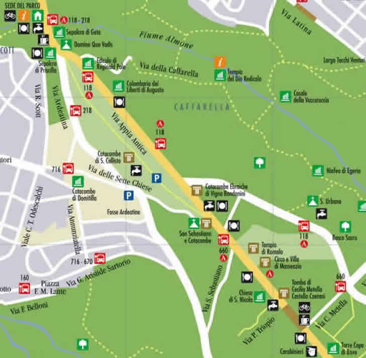 El bus turístico hop-on hop-off y los buses públicos de Roma te dan acceso directo a la sección de la Via Appia Antica entre el centro de información al turista y Cecilia Metella. Esta es la sección que la mayoría de turistas visitan. Solo diez de las 54 atracciones que se mencionan en el mapa se encuentran en este tramo, pero para la mayoría de visitantes esto es más que suficiente.